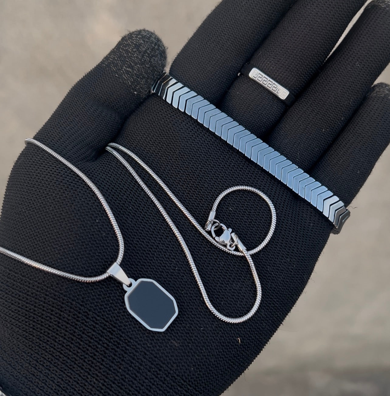 اس باکس میں شامل ہے ایک اسٹائلش چین، ایک بریسلٹ اور ایک خوبصورت انگوٹھی